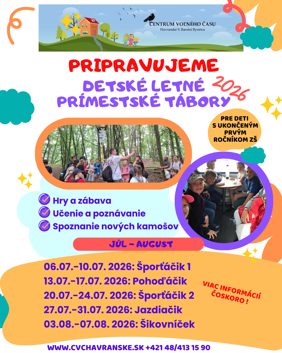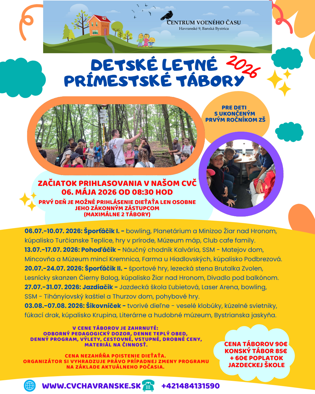 Hľadáš dobrodružstvo, zábavu a kopec nových zážitkov? Pridaj sa k nám na prímestské letné tábory 2026 v CVČ! Čaká ťa pestrý program, šikovní vedúci táborov a skvelá partia rovesníkov.